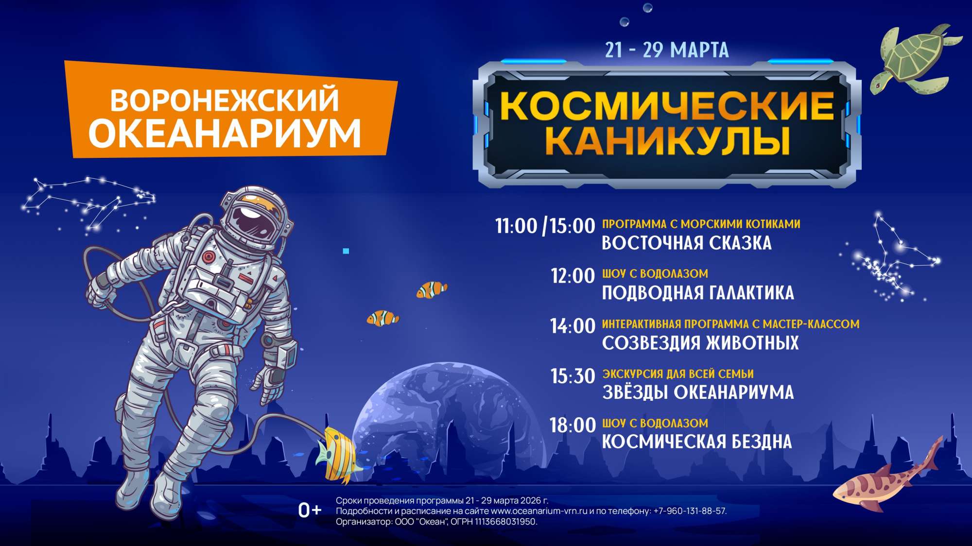Ежедневно в 12:00 шоу с водолазом «Подводная галактика», где вы отправитесь в фантастическое путешествие с астронавтом на новую экзопланету Нью-Терра под водой в главном океаническом аквариуме. В 14:00 приходите на интерактивную программу с мастер-классом «Созвездия животных» на котором в увлекательной, игровой форме расскажут о созвездиях, также дети смогут проявить свои творческие способности на мастер-классе по росписи деревянных брелоков, в 15:30 не пропустите экскурсию для всей семьи «Звезды океанариума», где вы узнаете интересные факты из жизни самых удивительных обитателей океанариума из разных континентов. А в 18:00 приходите на шоу «Космическая бездна» с погружением водолаза в главный аквариум и кормлением морских обитателей.