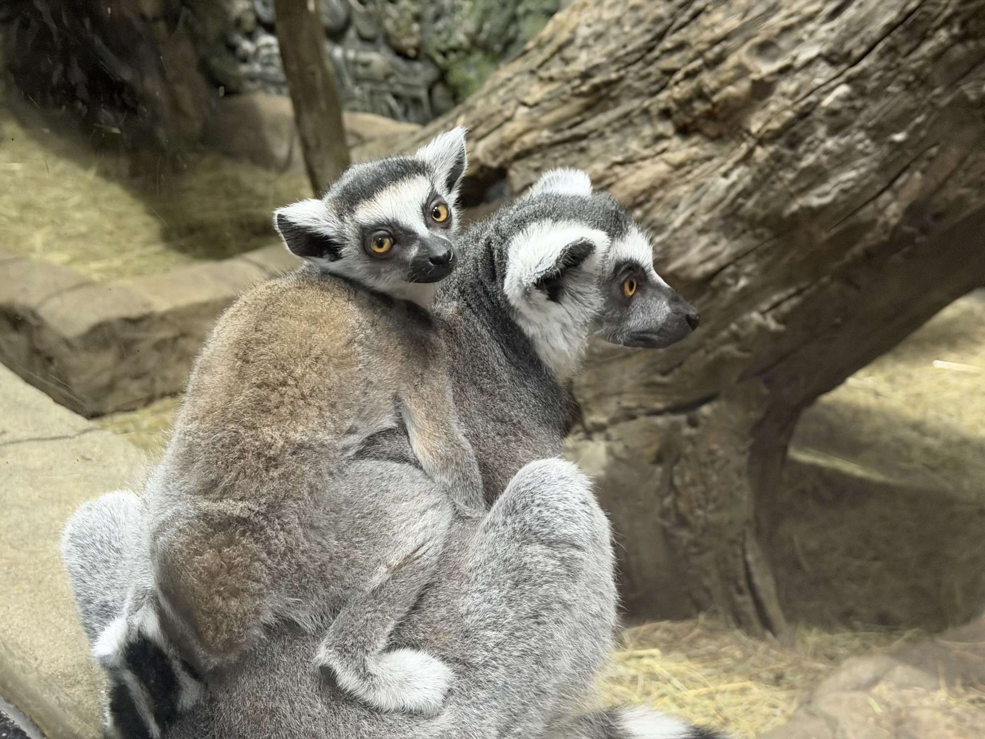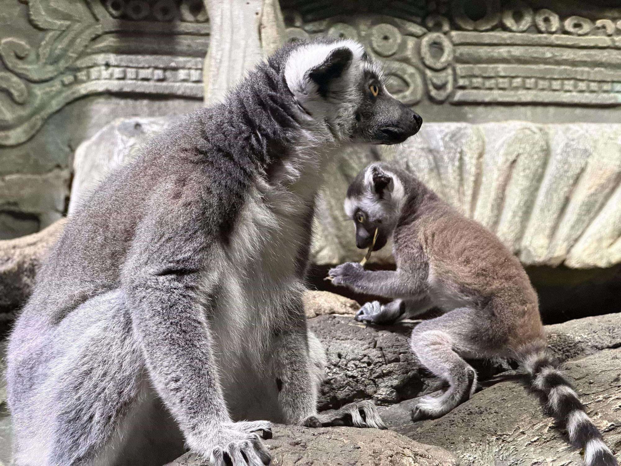 В первые месяцы новорожденный был неразлучен с мамой: сначала кроха висел на её животе, крепко вцепившись в шерсть, а чуть позже перебрался на спину. И только в возрасте 2 месяцев маленький лемур стал отпускать маму и начал понемногу изучать окружающий мир.